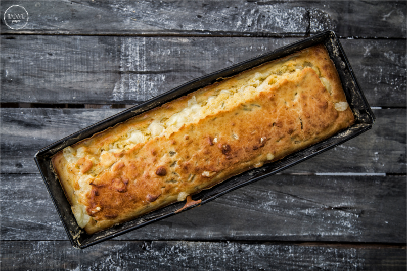 4) Βουτυρώνουμε και αλευρώνουμε μια ορθογώνια φόρμα του κέικ και βάζουμε το μείγμα του κέικ. Ψήνουμε για 40 λεπτά στους 175oC και αφήνουμε να κρυώσει για να σερβίρουμε.