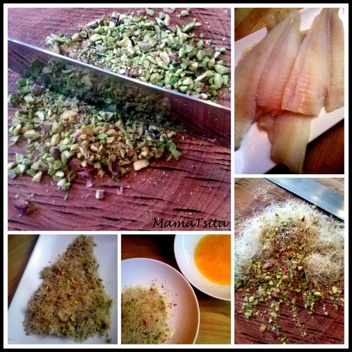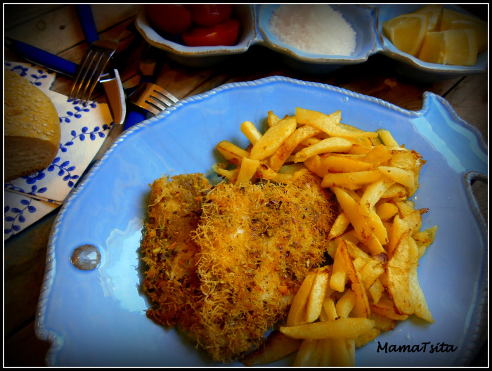 Είμαι ένας χαρούμενος άνθρωπος!!! Τα παιδιά μου έφαγαν ψάρι, αβασάνιστα. Αν κάνω ένα flash back θα θυμηθώ πως στην βρεφική τους ηλικία, τα πράγματα ήταν κάπως καλύτερα με το θέμα του φαγητού και ειδικότερα του ψαριού. Θυμάμαι πως τότε, την ψαρόσουπα την έτρωγαν ευχάριστα, με τη συνοδεία παραμυθιού που αφορούσε σε βαρκούλα που ταξίδευε με φουρτουνιασμένη θάλασσα. Το πιάτο τότε άδειαζε, πριν τελειώσει το παραμύθι. Κάπου στο προ νήπιο, το πράγμα άρχιζε να δυσκολεύει. Φτάνοντας στο σήμερα όπου το ψάρι έπρεπε να είναι σε χάρτινη συσκευασία, κομμένο αλφαδιά, μ’ έναν χαμογελαστό, γκριζομάλλη, παππούλη – καπετάνιο σε φωτογραφία. Καταλάβατε εσείς τώρα. Κάτι έπρεπε να γίνει και μάλιστα σύντομα. Μια μέρα λοιπόν κι ενώ σέρφαρα ξέγνοιαστα στο διαδίκτυο, έπεσα πάνω σ’ ένα tip για πανάρισμα με φύλο καταϊφι. Μου φάνηκε αρκετά ενδιαφέρον μιας και το φύλο καταϊφι το χρησιμοποιώ κι εγώ συχνά όπως για αυτήν εδώ τη συνταγή Ζαμπονοτυρόπιτα η μαλλιαρή. Σκέφτηκα λοιπόν να πανάρω, όχι τα σνίτσελ, αλλά τα φιλέτα ψαριού και να παίξω λιγουλάκι με την τύχη μου. Πρόσθεσα και φιστίκια Αιγίνης που τους αρέσουν πολύ και κάνει το πανάρισμα πιο τραγανό, τηγάνισα και πατάτες, έφτιαξα και σος και περίμενα αντιδράσεις.