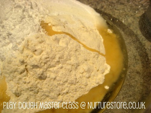 1. Πάρτε ένα μεγάλο μπολ και προσθέτουμε 2 φλιτζάνια αλεύρι, 1 φλιτζάνι αλάτι, 2 κουταλιές της σούπας φυτικό λάδι, 2 κουταλιές της σούπας κρέμα ταρτάρ (Είναι σκόνη και θα τη βρείτε στα σούπερ μάρκετ εκεί που είναι όλα τα μπαχαρικά ή εκεί που έχει τις βανίλιες. Αλλιώς λέγεται και Ξινό. Εναλλακτικά χρησιμοποιήστε λεμόνι).