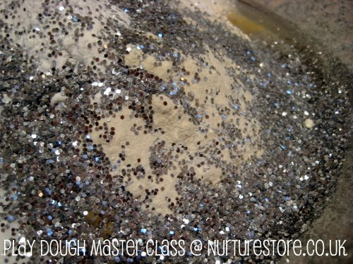 2. Προσθέστε κάτι έξτρα αν θέλετε, όπως glitter σε κόκκους. Βάλετε όσο αλεύρι χρειάζεται ώστε η ζύμη να μην κολλά στα χέρια.