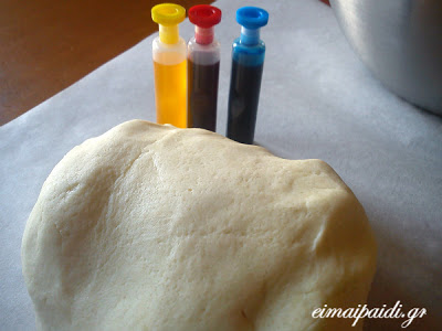 3. Προσθέστε και 1 1/2 – 2 φλιτζάνια ζεστό νερό στο μείγμα σας. Αρχίζει το ζύμωμα! Προμηθευτείτε χρώματα ζαχαροπλαστικής, θα είναι πολύ πιο ενδιαφέρον! Χωρίστε τη ζύμη στα 3 και ανακατεύετε τα χρώματα ώστε να έχετε τα 3 βασικά χρώματα.