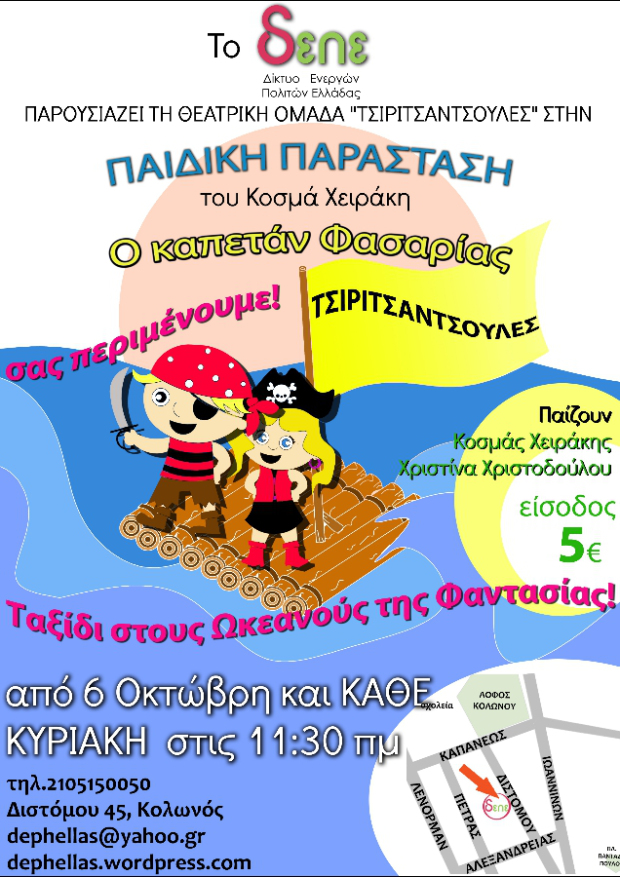 Έχει τίτλο «Ο Καπετάν Φασαρίας», τη δημιούργησε η πολύ πολύ αστεία θεατρική ομάδα Τσιριτσάντσουλες και παρουσιάζεται ύστερα από πρωτοβουλία του Δικτύου Ενεργών Πολιτών Ελλάδας (Δ.Ε.Π.Ε.), μια μη κερδοσκοπική εταιρία που διοργανώνει κοινωνικές- πολιτιστικές δράσεις. Στο έργο του Κοσμά Χειράκη, δύο φίλοι αποφασίζουν να γίνουν πειρατές και να κατακτήσουν τον κόσμο. Πριν καν ξεκινήσουν, μέσα από μπερδέματα και παρεξηγήσεις, αλλά και μέσα από την δυνατή φιλία που τους δένει θα ανακαλύψουν μικρές και μεγάλες αξίες της ζωής. Με δύο λόγια: κάθε φορά που με γενναιότητα κάνουμε το πρώτο βήμα, έρχεται κι άλλο ένα που μας φέρνει πιο κοντά στα όνειρα μας κι αυτά δεν πρέπει να τα εγκαταλείπουμε ποτέ.