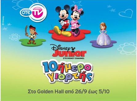 Αν σας έχουν λείψει η Μίνυ, ο Μίκυ, η πριγκίπισσα Sofia κι ο πειρατής Jake ευκαιρία να τους συναντήσετε στο εμπορικό κέντρο Golden Hall όπου θα σας περιμένουν για φωτογραφίες – πείτε στη μαμά και στο μπαμπά να σας βγάλουν πολλές- και διαδραστικά παιχνίδια. Το «10ήμερο Γιορτής Disney» είναι μια συνεργασία του OTE TV και του Disney Junior που αφορά παιδάκια από 3-10 ετών. Το πρόγραμμα να περιλαμβάνει: φωτογράφηση με τις μασκότ Mickey και  Minnie, ανάγνωση παραμυθιών, ζωγραφική, χειροτεχνίες και χορό.