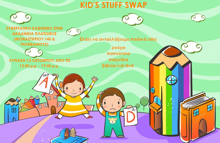 Info: Kid’s Stuff Swap: 13/10, 12:00-19:00, Συνεργατικό Καφενείο στην Ακαδημία Πλάτωνος, Μοναστηρίου 140 & Τηλεφάνους. Πληροφορίες: 694 9471672, Χρύσα Σιώπα/ 698 1278825 Βάσια Χατζηιωάννου.