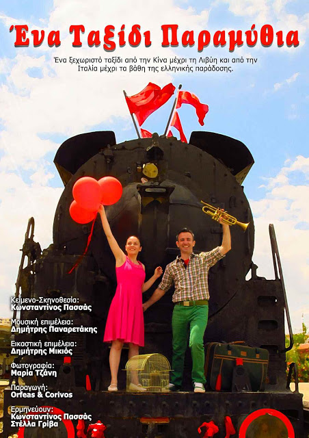 Θα επιβιβαστούμε στην παράσταση «Ένα ταξίδι παραμύθια» και θα κάνουμε σούπερ εξωτικό ταξίδι με τη φαντασία μας. Δύο ηθοποιοί-ερμηνευτές υποδύονται δεκάδες ρόλους σε ένα ξεχωριστό ταξίδι από την Κίνα μέχρι τη Λιβύη και από την Ιταλία μέχρι τα βάθη της ελληνικής παράδοσης.