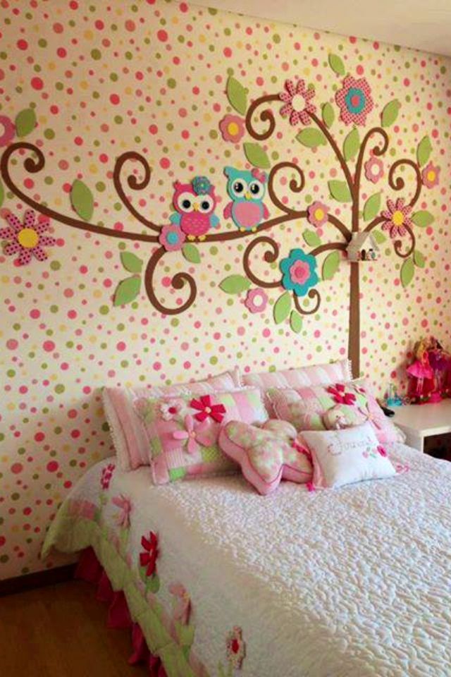 1. Όμορφα παλ χρώματα, για τις μικρές κυρίες! Όμορφο απλό δέντρο, στολισμένο με κουκουβάγιες, λουλούδια και φυλλαράκια! Αφού ζωγραφίσετε το δέντρο σας, έχετε 2 επιλογές. Αγοράζετε έτοιμα τα υπόλοιπα διακοσμητικά και ξεμπερδέψατε, ή αγοράζετε χρωματιστά χαρτόνια και οπλίζεστε με υπομονή και ψαλίδι! Ό,τι και να αποφασίσετε σίγουρα θα το διασκεδάσετε!