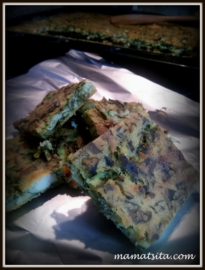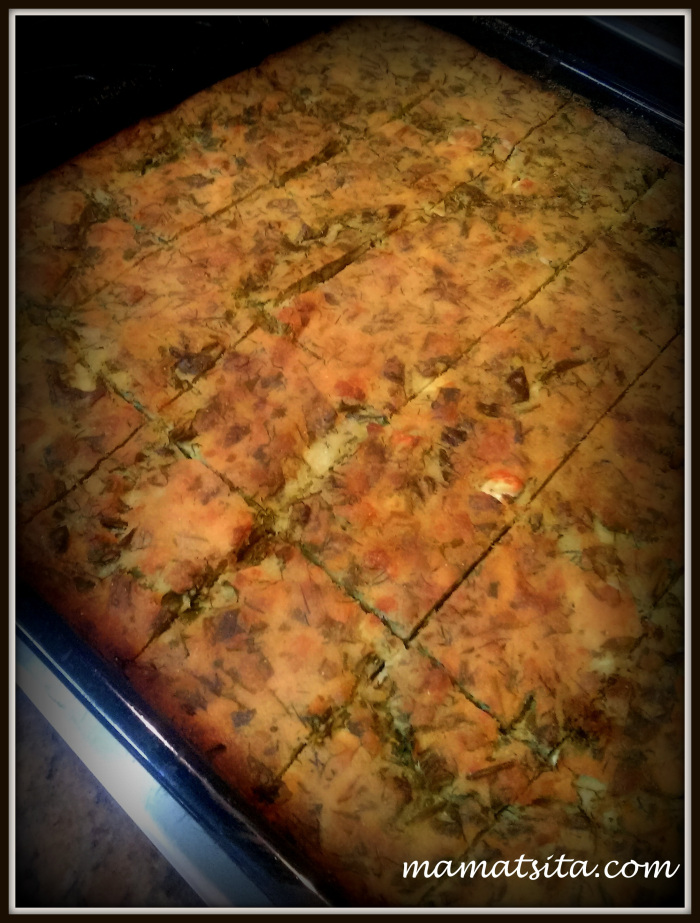 “Πάρε 4 ματσάκια φρέσκα κρεμμύδια, πλύντα καλά, χοντρόκοψε μόνο το πράσινο μέρος κι ελάχιστο από το λευκό και βάλτα σε σουρωτήρι. Αλάτισε τα καλά και τρίψτα με τα χέρια σου για να φύγει η αψάδα τους. Ξέπλυνε τα με άφθονο νερό κι άστα να στραγγίξουν. Πάρε το ταψί σου και λάδωσε το καλά. Πολύ καλά. Σε μια λεκάνη ρίξε τα κρεμμύδια, ένα ματσάκι άνηθο κι ένα ματσάκι μαϊντανό, φέτα τριμμένη, αλάτι και πιπέρι. Ανακάτεψε τα και ρίξε το καλαμποκάλευρο. Πρόσθεσε 1 κούπα χλιαρό νερό και 2/3 της κούπας γάλα. Αυτό θα σου δώσει το χυλό. Αν ο χυλός είναι αραιός πρόσθεσε κι άλλο καλαμποκάλευρο. Αν πάλι ο χυλός είναι παχύς, αραίωσε τον με λίγο νεράκι. Όλο αυτό το στρώνεις στο ταψί και ρίχνεις από πάνω κι άλλο ελαιόλαδο. Πρόσεχε παιδάκι μου, στην πίτα σου να φαίνεται πιο πολύ το πράσινο κι όχι ο χυλός. Σταύρωσε το ταψί σου και ψήσε την πίτα σου σε καλά ζεσταμένο φούρνο.”