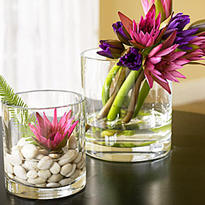 Τα δοχεία αυτά είναι ιδανικά για να αναδείξουν με τον πιο απλό τρόπο την μαγεία και την ομορφιά των χρωμάτων. Δοχεία διάφανα στα οποία θα κρύψετε επιμελώς μέσα το πράσινο σφουγγάρι που χρησιμοποιείται και στα ανθοπωλεία και θα αρχίσετε να «καρφώνετε» άνθη συνθέτοντας… ομορφιές! Η επανάληψη είναι ένα μικρό τρικ, το οποίο θα δώσει χαρακτήρα στις συνθέσεις σας αφού τα πολλά έντονα και διαφορετικά χρώματα των λουλουδιών κουράζουν, πολλές φορές, το μάτι.