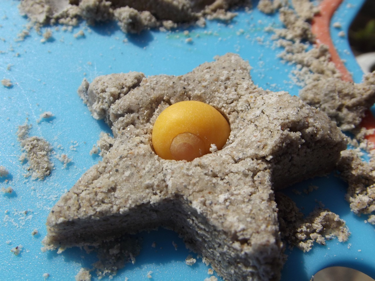 Ανακατεύουμε την άμμο με το καλαμποκάλευρο ώστε να γίνει ενιαίο μείγμα. Προσθέτουμε την κόλλα και αρχίζουμε να πλάθουμε ως ότου γίνει σαν ζυμάρι. Αν παραμένει πολύ πηχτό και τρίβεται, προσθέτουμε λίγη ακόμη κόλλα ή λίγο νερό. Αν είναι υδαρές, προσθέτουμε λίγο καλαμποκάλευρο.