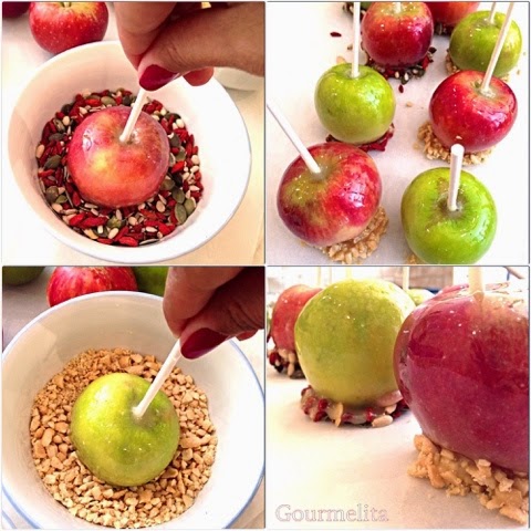 Καταλαβαίνετε ότι είναι από τις γεύσεις που με συγκινούν ακόμα…Εδώ σας προτείνω μια παραλλαγή τους, με καραμέλα βουτύρου. Αυτά τα μήλα, είναι καλυμμένα με μαλακή, χρυσή καραμέλα, και μπορείτε να τα κόψετε και σε φέτες για να τα σερβίρετε-στα 4. Μπορείτε επίσης-όπως έχω κάνει κι εγώ εδώ-να βουτήξετε τις άκρες τους μέσα σε αλεσμένους ξηρούς καρπούς ή αποξηραμένα φρούτα. Ιδανικά φτιάξτε τα με βιολογικά μηλαράκια, που είναι και πιο μικρά, αλλά και πιο ασφαλή, μιας και καταναλώνουμε και την φλούδα τους.
