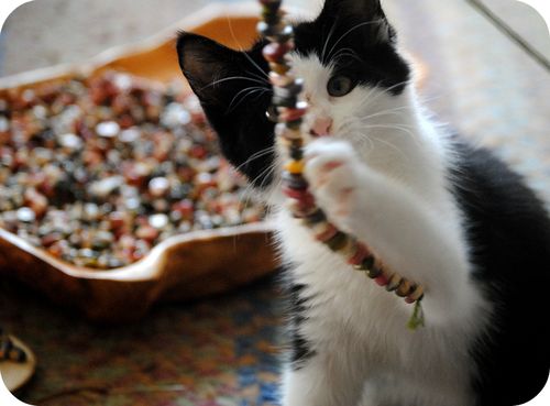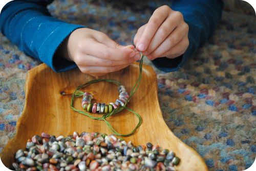 – Και αρχίζει η δημιουργία! Κλωστή και βελόνα γρήγορα! Για το κολλιέ μπορείτε να χρησιμοποιήσετε πετονιά και για το βραχιόλι λεπτό λαστιχάκι για να έχει μια ελαστικότητα και να περνά από το χέρι. Και τα δύο θα τα βρείτε στα βιβλιοπωλεία ή στα καταστήματα με είδη χόμπι.
