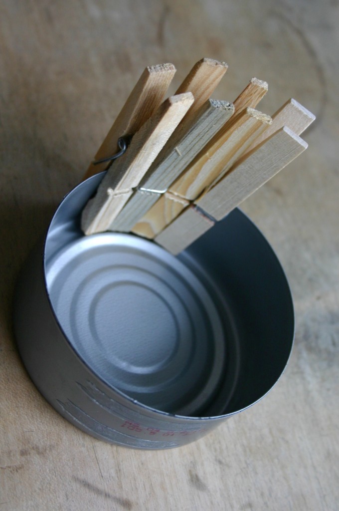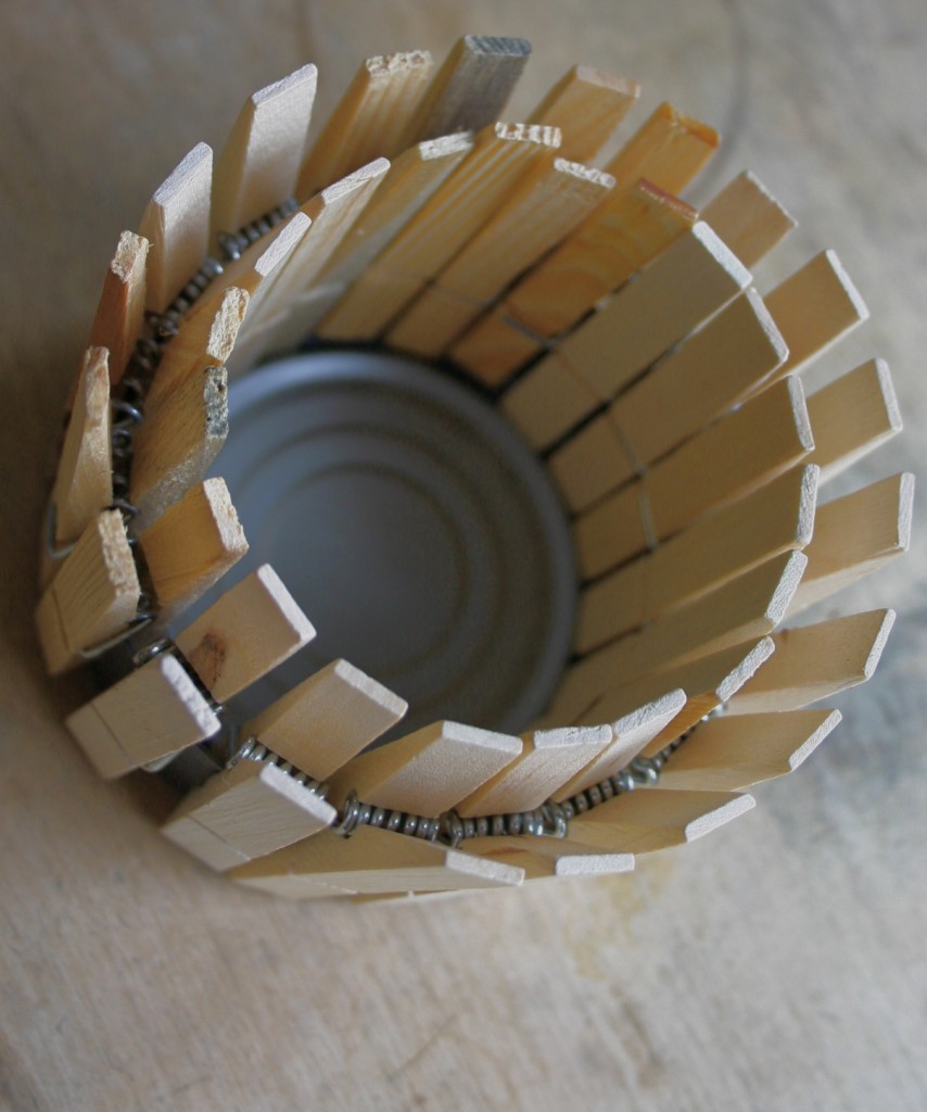 Αφού πλύνουμε και στεγνώσουμε το αλουμινένιο κουτάκι, αρχίζουμε να τοποθετούμε τα μανταλάκια κυκλικά γύρω του. Αν θέλουμε μπορούμε προηγουμένως να χρωματίσουμε τα μανταλάκια σε όποια απόχρωση μας ταιριάζει.