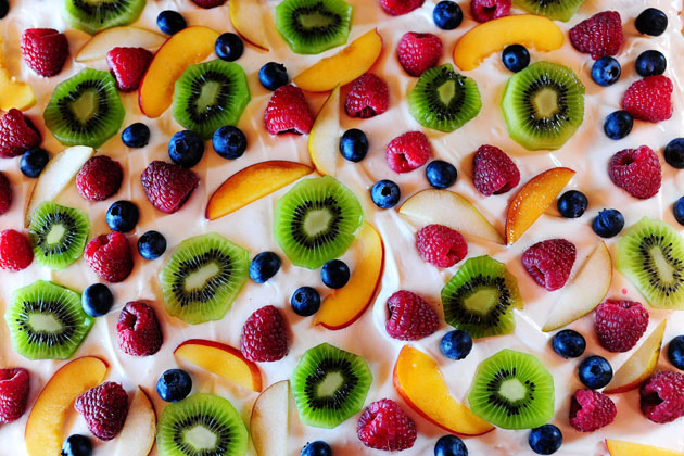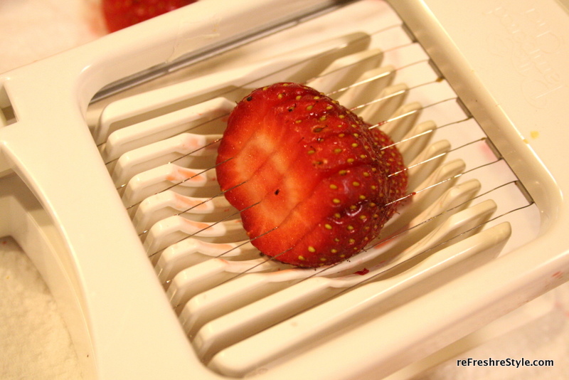 Κόβουμε τα φρούτα στο κατάλληλο σκεύος σε φέτες.
