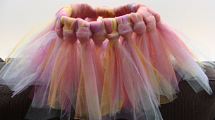 Για τη φούστα, θα χρειαστείτε ένα λάστιχο για να το προσαρμόσετε στη μέση. Γύρω από το λάστιχο θα στερεώσετε με απλές θηλιές, λωρίδες τούλι σε όποιο χρώμα σας αρέσει. Εμείς βρήκαμε και σας προτείνουμε σε ροζ και μαύρο, 2 εκδοχές για να διαλέξετε!