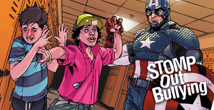 Οι υπερήρωες της Marvel κατά του bullying! Τα εξώφυλλα που λένε «όχι» στο σχολικό εκφοβισμό και στις διακρίσεις… Η διασημότερη, ίσως, εταιρία κόμικς αφιερώνει τα εξώφυλλά της ενάντια στον εκφοβισμό και τις διακρίσεις, σε μια κοινή καμπάνια με τον οργανισμό «Stomp Out Bullying». Ο Κάπτεν Αμέρικα, ο Χαλκ, οι «Εκδικητές», οι «Φύλακες του Γαλαξία» και αρκετοί άλλοι υπερήρωες από το σύμπαν της Marvel πρόκειται να φιγουράρουν στις ειδικές εκδόσεις που θα κυκλοφορήσουν τον Οκτώβριο, παγκόσμιο μήνα δράσης κατά του bullying, σε μια προσπάθεια να γίνει ακόμα πιο ηχηρή η ανάγκη καταπολέμησης ενός φαινομένου που τρέφει η εποχή μας.