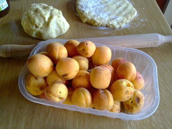 Σε δυνατή φωτιά καραμελωνούμε τα βερίκοκα. Ύστερα φτιάχνουμε τη ζύμη: ανακατεύουμε με τα δάχτυλα τη ζάχαρη, το αλεύρι και το βούτυρο μέχρι να σχηματιστούν μεγάλα ψίχουλα.