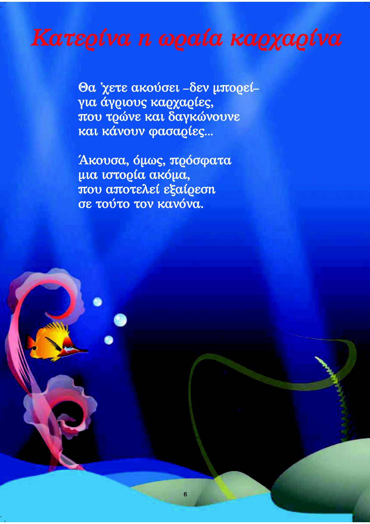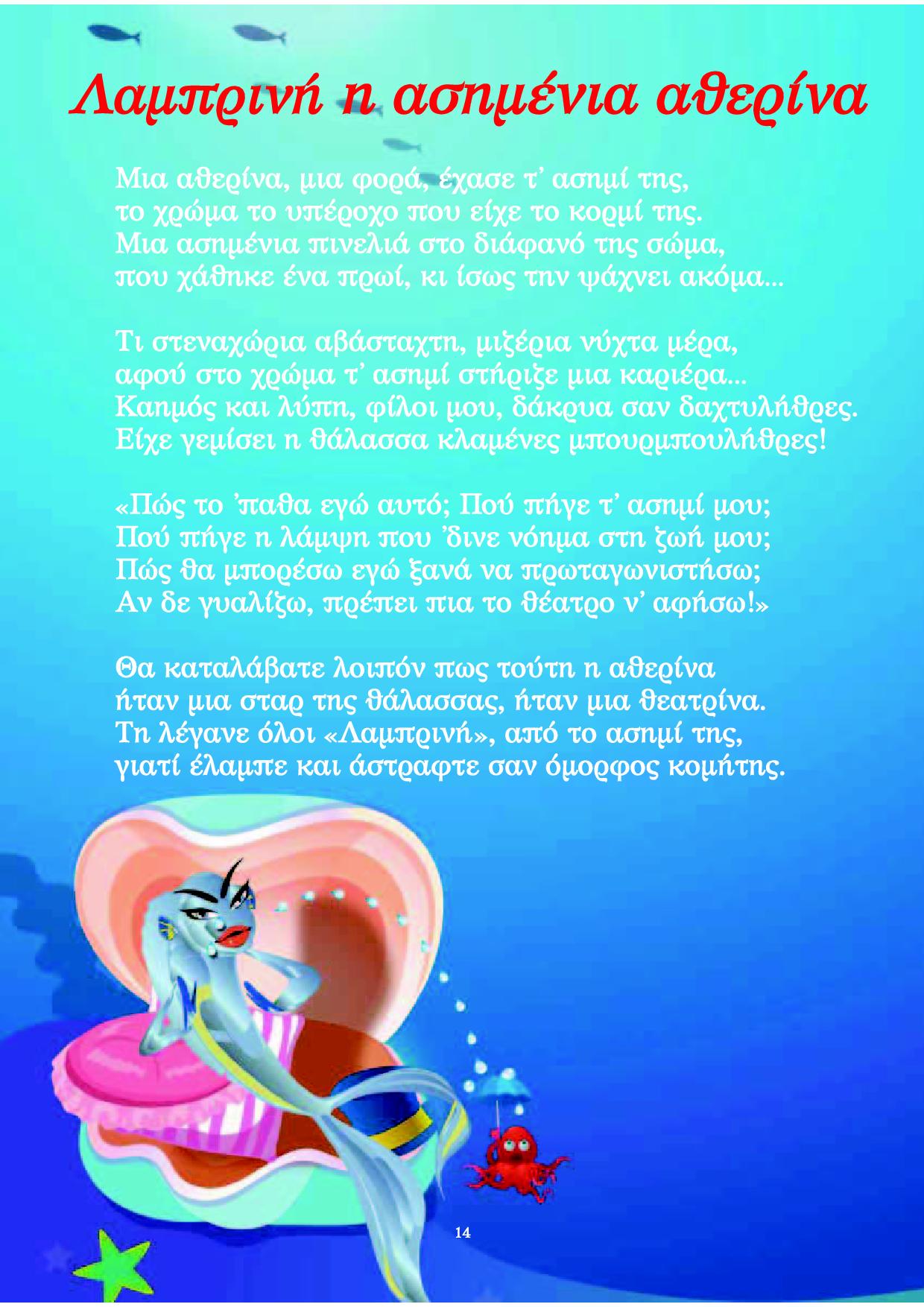 Σε μία εποχή όπου η συμφιλίωση με το περιβάλλον φαντάζει ως η πολυτιμότερη αξία, διαβάστε και ξαναδιαβάστε αυτά τα υπέροχα έμμετρα παραμυθάκια, που είναι αφιερωμένα στη θαυμαστή ζωή της θάλασσας.