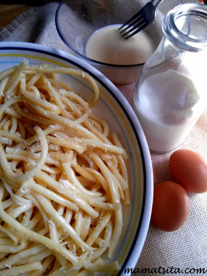 Χτύπα δύο αυγά και 1/2 κούπα γάλα με δύο κουταλιές τριμμένο τυρί και  ρίξτα στα μακαρόνια που μόλις έβρασες.