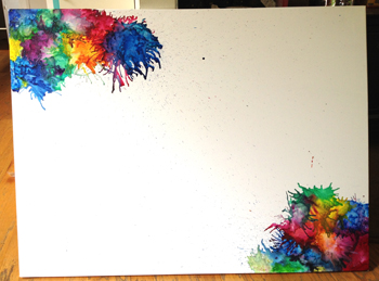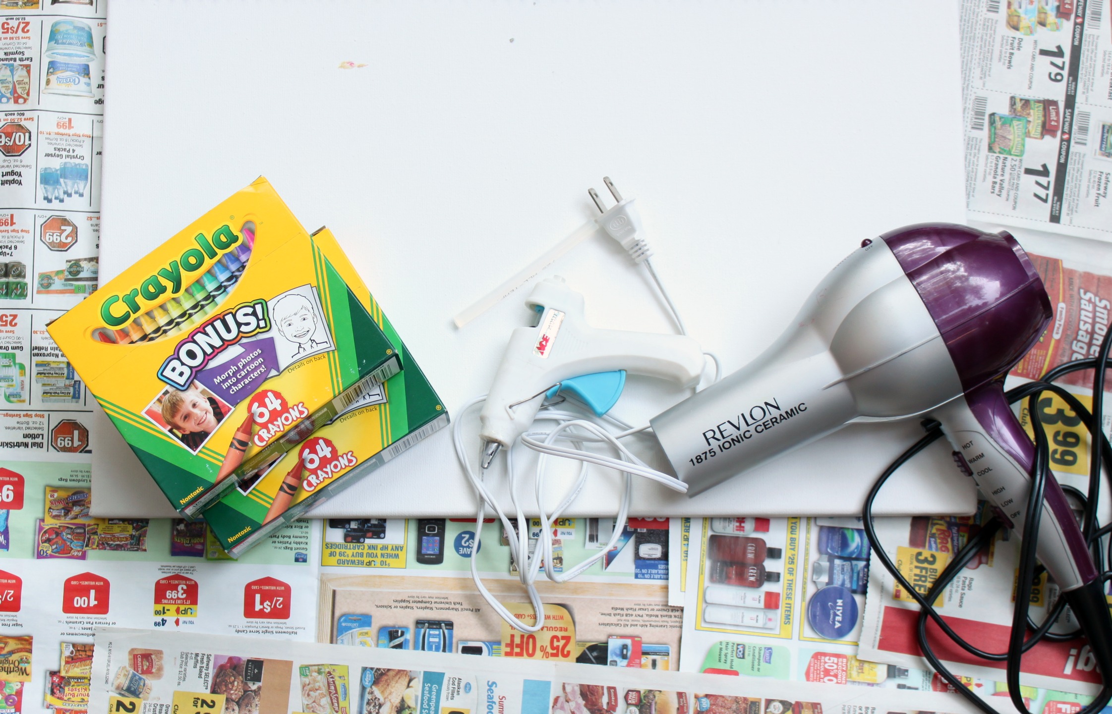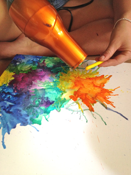3. Παίρνουμε το τελάρο και με το πιστολάκι ξεκινάμε να δημιουργούμε ευφάνταστους πίνακες! Ζεσταίνουμε την κηρομπογιά έως ότου αρχίσει να εμφανίζεται στον καμβά. Προσέχουμε να την κρατάμε από την άκρη έτσι ώστε να μην καούμε από τη θερμοκρασία του αέρα. Είναι προτιμότερο να ξεκινήσουμε από μια γωνία για περισσότερο έλεγχο του αποτελέσματος.