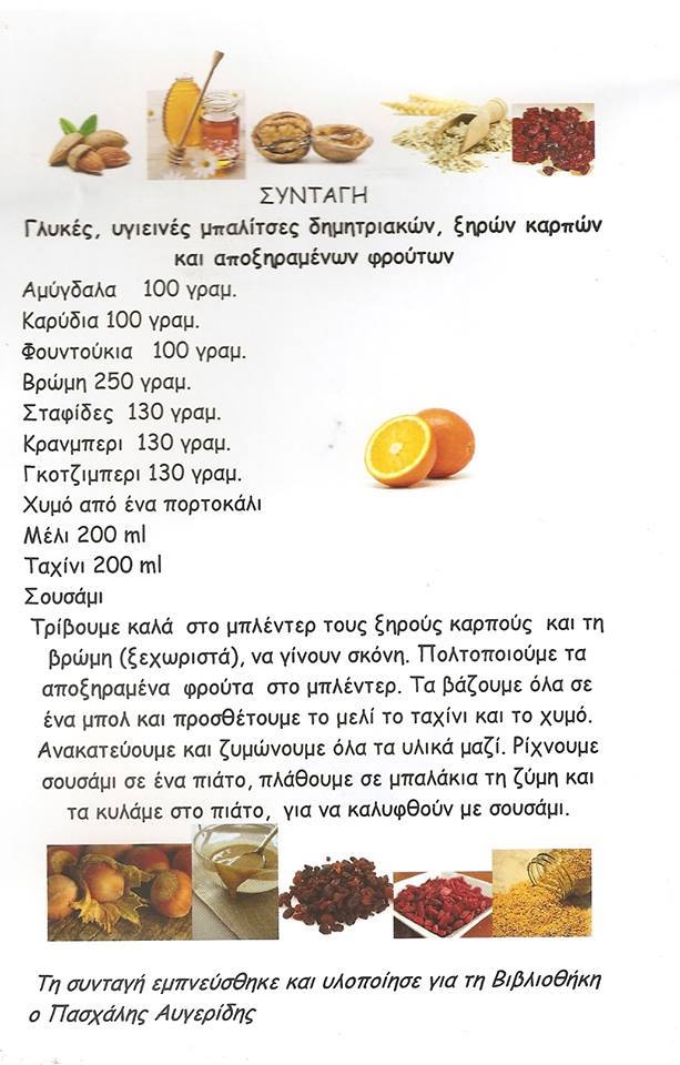 Μια συνταγή για υγιεινές μπαλίτσες δημητριακών, ξηρών καρπών και αποξηραμένων φρούτων που εμπνέυστηκε ο Βιβλιοθηκονόμος – σεφ – μαγειροδημιουργός Πασχάλης Αυγερίδης.