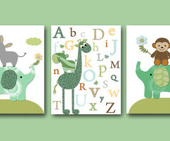 Για αρχή θα κινηθούμε στα πράσινα! Αυτοκόλλητο σε 4 αποχρώσεις του πράσινου για τα ζωάκια. Έτοιμα αυτοκόλλητα γράμματα εάν δεν θέλετε να κοπιάσετε καθόλου. Προσθέστε πινελιές καφεκόκκινου – 1 σωληνάριο τέμπερας είναι αρκετό ή ένας μαρκαδόρος. Έτοιμα!