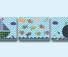 Ένα σεντόνι παλιό έχετε; Θα το κολλήσετε με ατλακόλ στα τελάρα ζωγραφικής και θα περιμένετε τουλάχιστον 24 ώρες. Το καταλάβαμε; Ωραία, το δύσκολο πέρασε! Βάλτε τη φαντασία σας σε λειτουργία και φέρτε και άλλα υφάσματα. Κόψτε ψαράκια, καραβάκια, φάλαινες και όλα τα ψαρικά του βυθού! Είστε έτοιμοι!