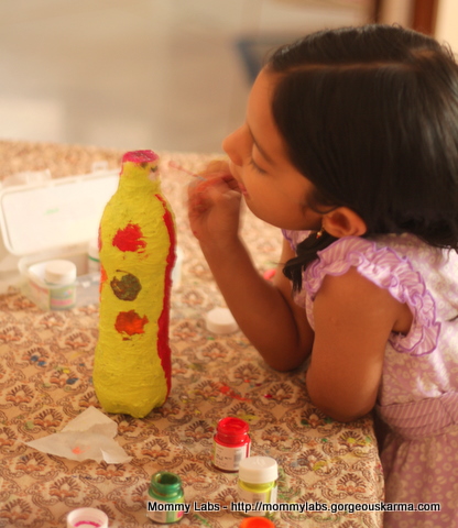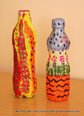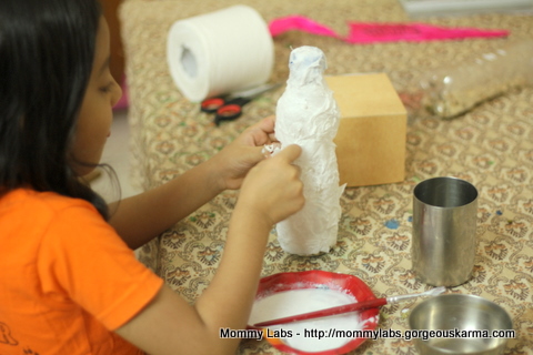 5. Αν προτιμήσουμε πλαστικό μπουκάλι, διακοσμούμε με χαρτί κουζίνας και ατλακόλ. Αφήνουμε την κόλλα να στεγνώσει. Επαναλαμβάνουμε τη διαδικασία 2-3 φορές. Στη συνέχεια ζωγραφίζουμε.