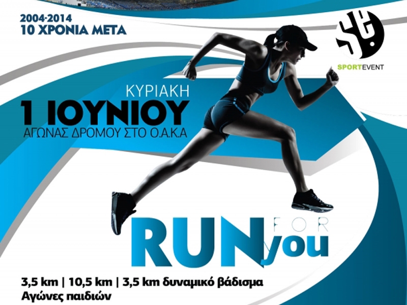Η Sportevent διοργανώνει στις 1 Ιουνίου 2014 τον 2ο αγώνα δρόμου, 3,5χλμ και 10,5 χλμ, με την επωνυμία ¨Run for you¨, 2004-2014 – 10 χρόνια μετά, στον περιβάλλων χώρο του ΟΑΚΑ