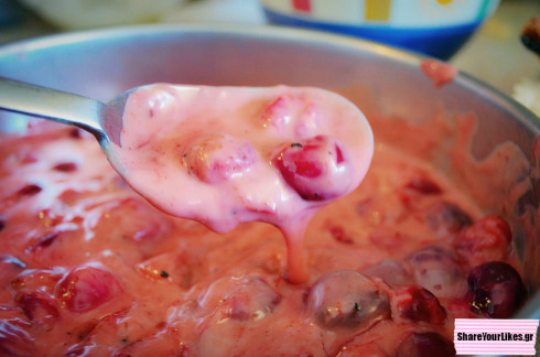 5. Στο ίδιο σκεύος, προσθέτεις ξανά λίγο βούτυρο και ρίχνεις τα κεράσια(από τα οποία έχεις πρώτα αφαιρέσει τα κουκούτσια) και τις φράουλες, κομμένες στα 2 ή 4.