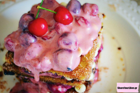 Αντί για ρολάκια, θα έφτιαχνα ένα πύργο με στρώσεις από ψωμάκια του τοστ και τη κρεμώδη γέμιση με τα κεράσια. Σαν να είχαμε μια… γυμνή τούρτα (γυμνή από τα naked cakes που κατακλύζουν το internet. Γκούγκλαρέ το.) Έτοιμη σε 10′. Το είπα αυτό; Δεν το είπα! Σε 10’!