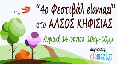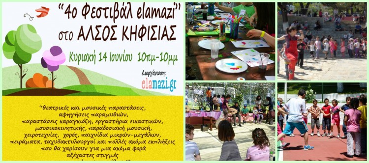 Το elamazi.gr προσκαλεί μικρούς και μεγάλους την Κυριακή 14 Ιουνίου 2015 από τις 10.00 το πρωί μέχρι τις 10.00 το βράδυ για να γιορτάσουμε μαζί την «έναρξη του καλοκαιριού των παιδιών» μέσα σε μια πραγματική όαση το Άλσος Κηφισιάς.