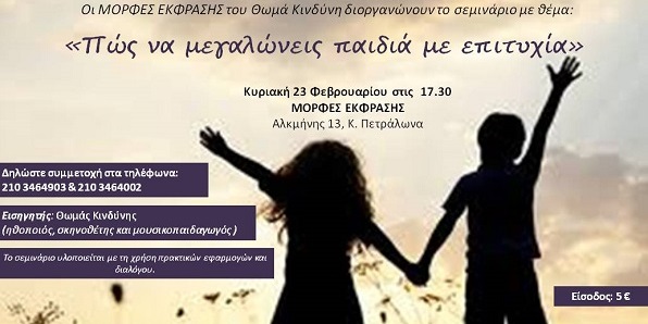 Οι Μορφές Έκφρασης του Θωμά Κινδύνη διοργανώνουν μία σειρά σεμιναρίων που αφορούν σε θέματα της καθημερινότητας και ανθρωπίνων σχέσεων και που υλοποιούνται με τη χρήση πρακτικών εφαρμογών και διαλόγου. Την Κυριακή 23 Φεβρουαρίου στις 17.30 θα πραγματοποιηθεί το πρώτο σεμινάριο με θέμα: «Πώς να μεγαλώνεις τα παιδιά με επιτυχία» Σ’[…]