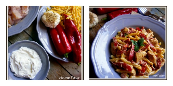 κοτόπουλο, πιπεριές Φλωρίνης και σάλτσα γιαούρτι.