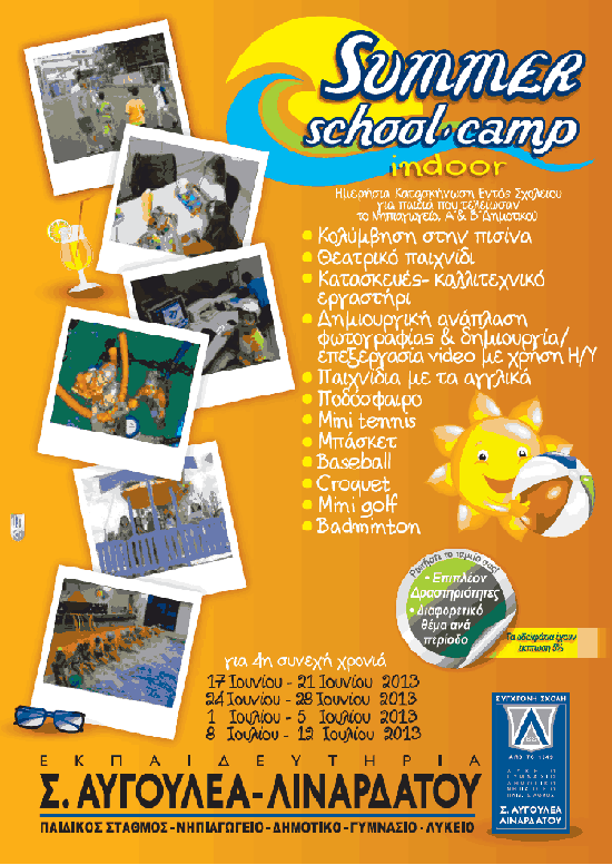 Τα Εκπαιδευτήρια Σ. Αυγουλέα-Λιναρδάτου πραγματοποιούν για 4η συνεχή χρονιά την Ημερήσια Κατασκήνωση Εντός Σχολείου με τίτλο: Summer School Camp INDOOR 2013, για παιδιά που τελείωσαν το Νηπιαγωγείο, Α´ & Β´ Δημοτικού (17/06 έως 12/07).