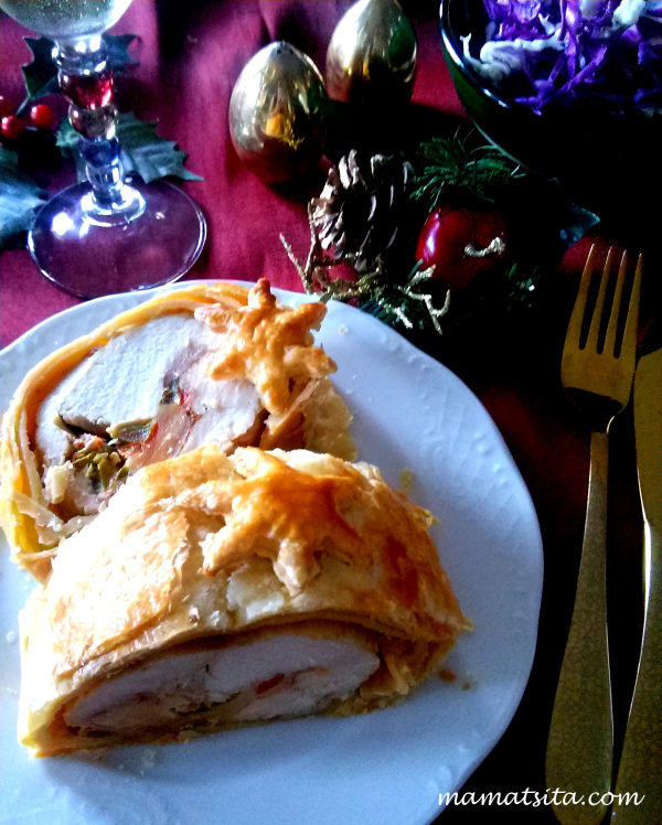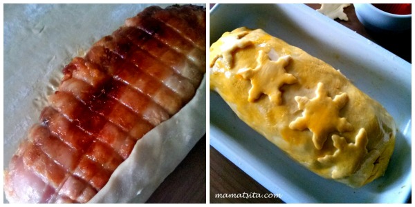 Σε ένα φύλλο σφολιάτα βουτύρου τυλίγεις το ρολό, αλείφεις με τον κρόκο αυγού, τοποθετείς σε καλά βουτυρωμένο σκεύος και ψήνεις σε προθερμασμένο φούρνο στους 170 για 20 περίπου λεπτά ή μέχρι η σφολιάτα να πάρει ένα όμορφο χρυσαφένιο χρώμα.