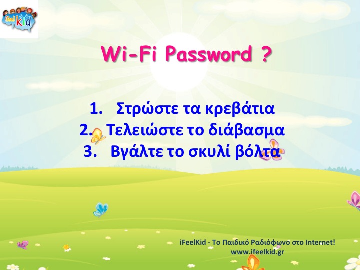 Wi-Fi password…? 12/05/2014 • Quotes • No Comments Wi-Fi password…? iFeelKid team www.ifeelkid.gr kids internet radio